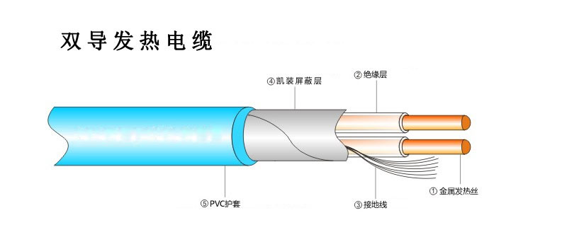 雙導發(fā)熱電纜它的內部有金屬發(fā)熱絲和銅導體兩根芯焊接而成,雙導發(fā)熱電纜自成回路,在發(fā)熱電纜線尾部,發(fā)熱電纜線芯可以折回,接線時只要連接發(fā)熱電纜線的接線端即可。 由于雙導發(fā)熱電纜本身自成回路,所有的接線全在同一端,在施工中,只要接線端連接供電電源,不需要接線的尾端,可根據(jù)具體情況任意放置,與單導發(fā)熱電纜相比,大大減少了施工的難度,越來越得到人們的青睞。發(fā)熱電纜結構: